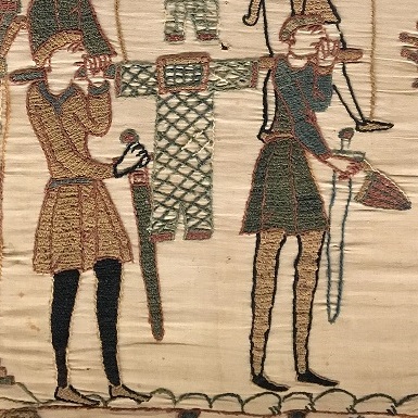 Une image de la Tapisserie de Bayeux avec deux normands transportant une armure